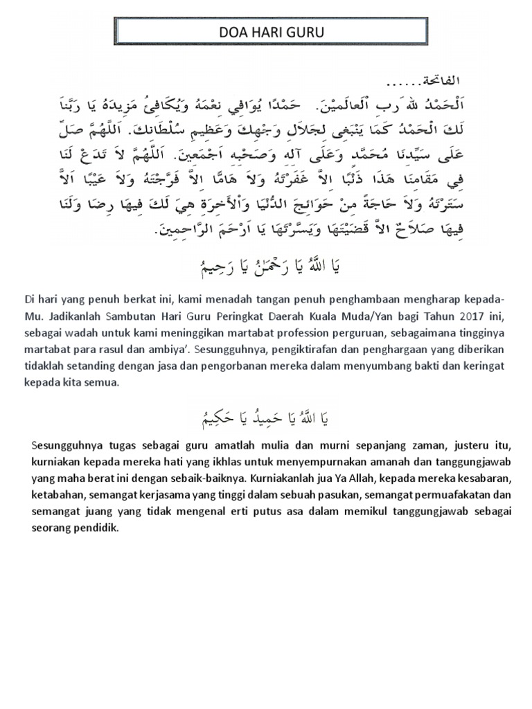 Buku panduan doa majlis rasmi sekolah doa sempena menghadapi peperiksaan awam (2) ِِسْمِ الِ ال ّحْ ya allah ya tuhan kami sesungguhnya kami berkumpul pada hari ini keranamu ya allahkami berkumpul untuk mengisi seluruh hidup kami dengan keredhaanmu ,kamiberkumpul untuk. اَلْحَمْدُ للهِ رَبِّ العَالَمِيْنَ , وَالعَاقِبَة لِلْمُتَّقِيْنَ َالصَّلاَة ُوَالسَّلاَمُ عَلَى سَيِّدِنَا مُحَمَّدٍ وَعَلَى آلِهِ وَأَصْحَابِهِ أَجْمَعِيْنَ. Ya allah , tuhan semesta alam. Hari guru antarabangsa di amerika latin disambut pada 11 september. Sebagai siswa yang baik, jangan lupa untuk memberikan ucapan selamat hari guru atau doa untuk guru.