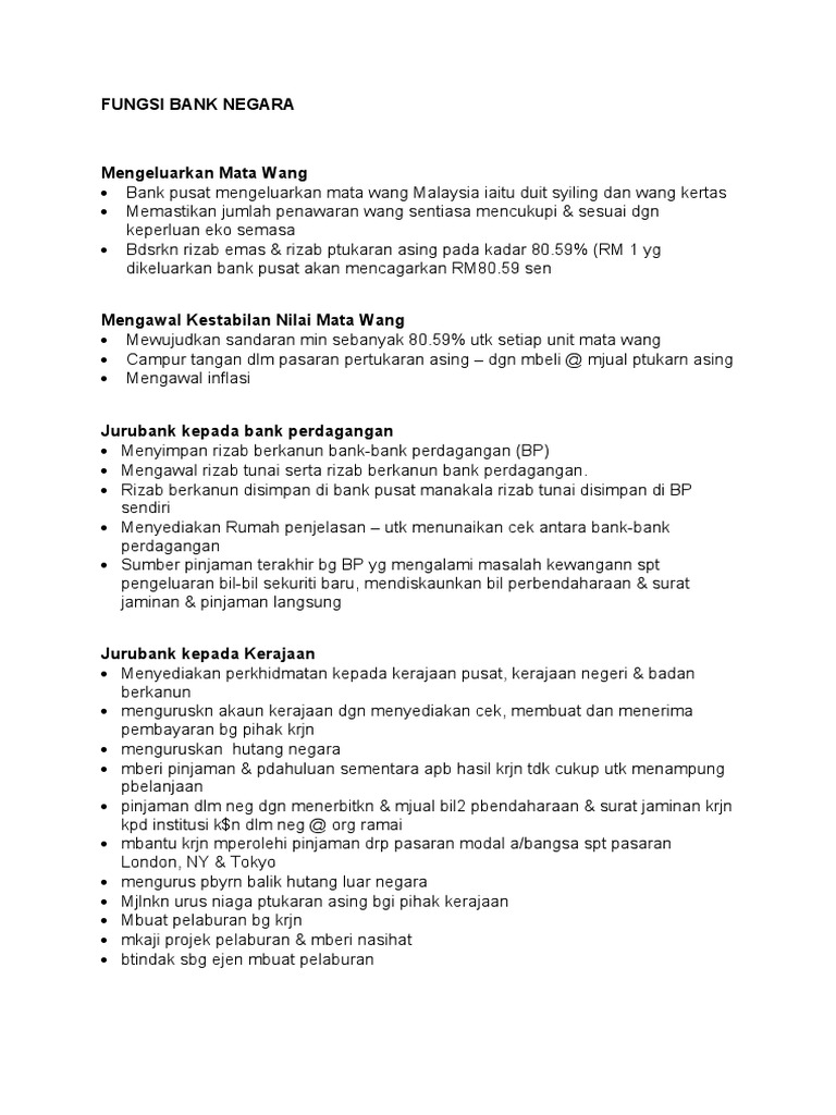The central bank of malaysia is the malaysian central bank. Menerima simpanan dari pelanggan 2. See full list on majalahlabur.com Fungsi bank pusat bank pusat negara kita iaitu bank negara malaysia adalah jurubank kerajaan dan bertindak sebagai pengawal wang negara malaysia. Jika inflasi tinggi, orang awam akan cenderung melindungi kuasa membeli mereka sekaligus menyebabkan permintaan untuk aset tetap seperti rumah dan hartanah yang dianggap sebagai kalis inflasi, akan melonjak.