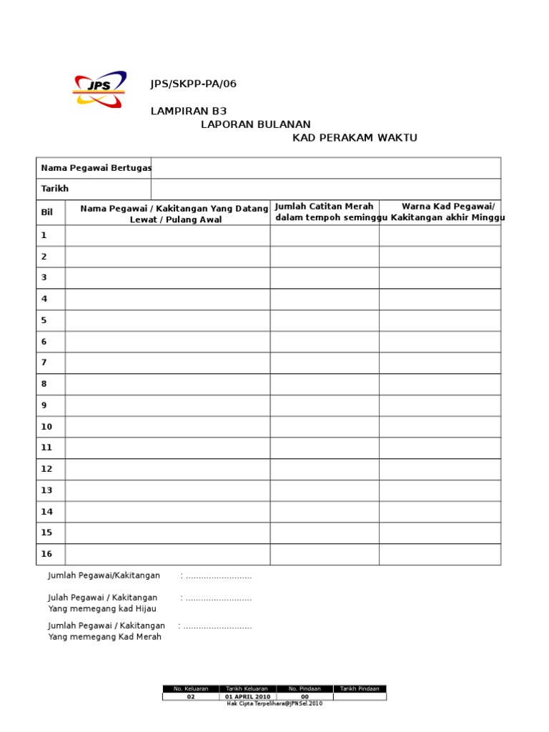 (i) pegawai a, waktu masuk pada pukul 7.20 pagi dan waktu pulang pada pukul 4.30 petang; Pengurusan kad perakam waktu 2. For more information and source, see on this link : 2004 spa 01 tambahan bagi surat pekeliling am bil 11 tahun 1981 penggunaan sistem perakam waktu elektronik di agensi agensi kerajaan pages 1 5 text version anyflip Pengurusan kad perakam waktu (baru) 1.